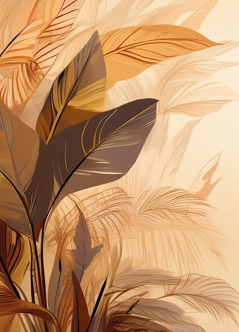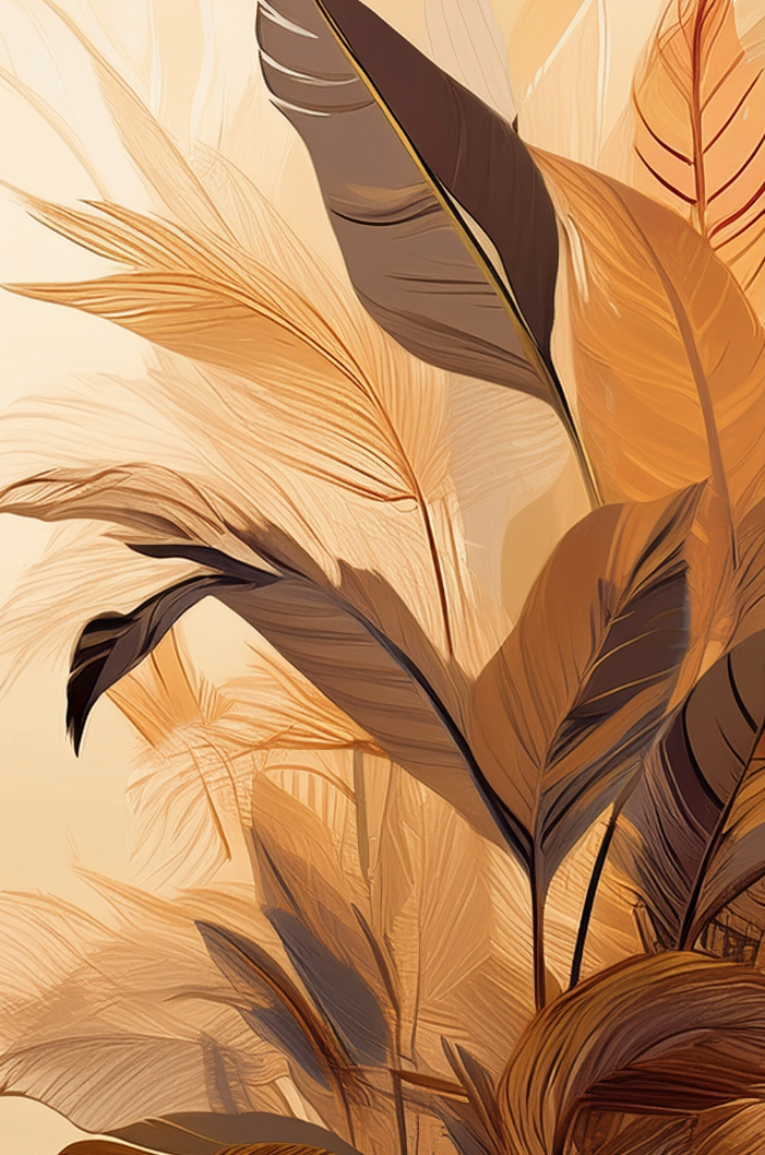 Decorative wall with drawings of plants, leaves, and various circular patterns resembling seeds or flowers, in earthy tones of orange, brown, and green.